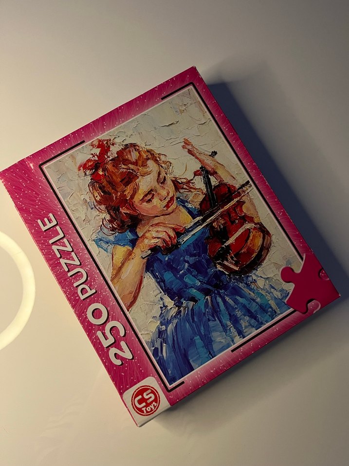 250 parçalı, pembe kutulu, keman çalan kız resmi içeren renkli çocuk yapbozu.
