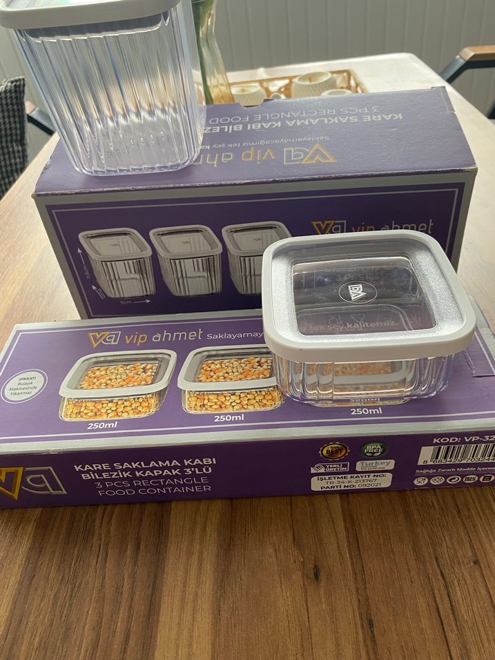 Her biri 250ml kapasiteli, açık mor renkli 5 adet kare saklama kabı seti. Şeffaf kapaklı, güvenli saklama sağlar. Her kutuda 3 tane var kullanılmadı hiç