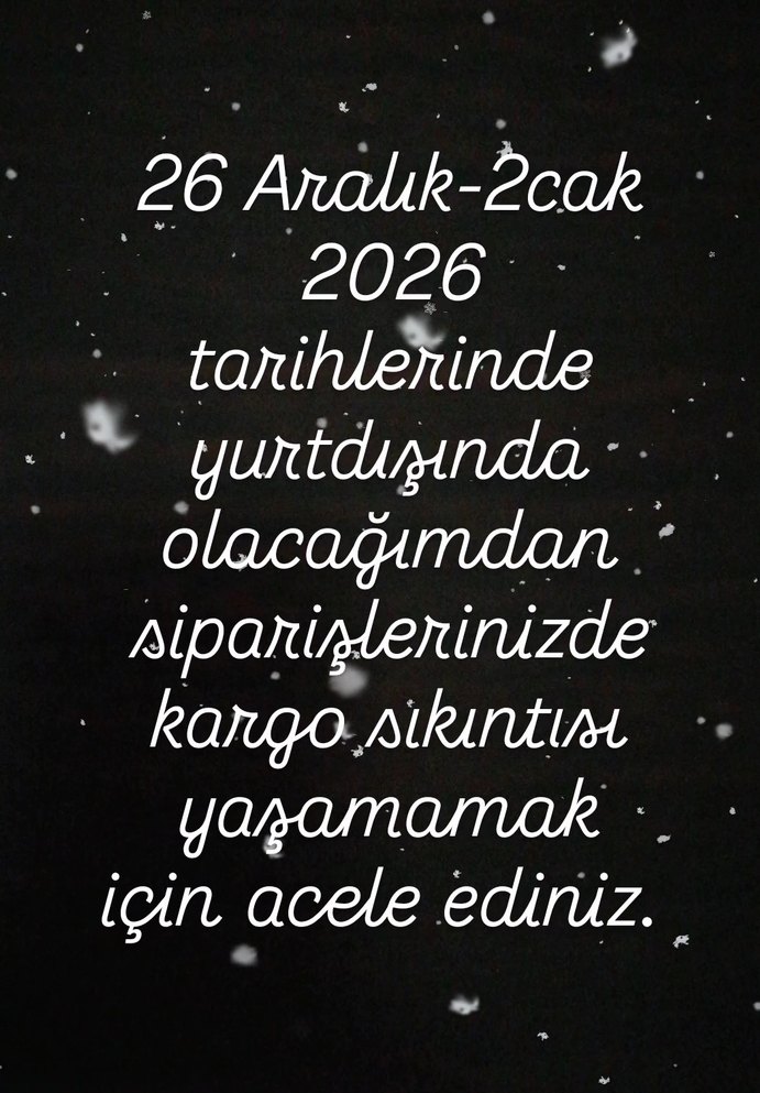 26 Aralık-2 Ocak 2026 tarihleri arasında yurtdışında olunacağımdan kargo gecikmeleri yaşanabilir, siparişlerinizi erken veriniz.Duyarlılığınız için teşekkürler.