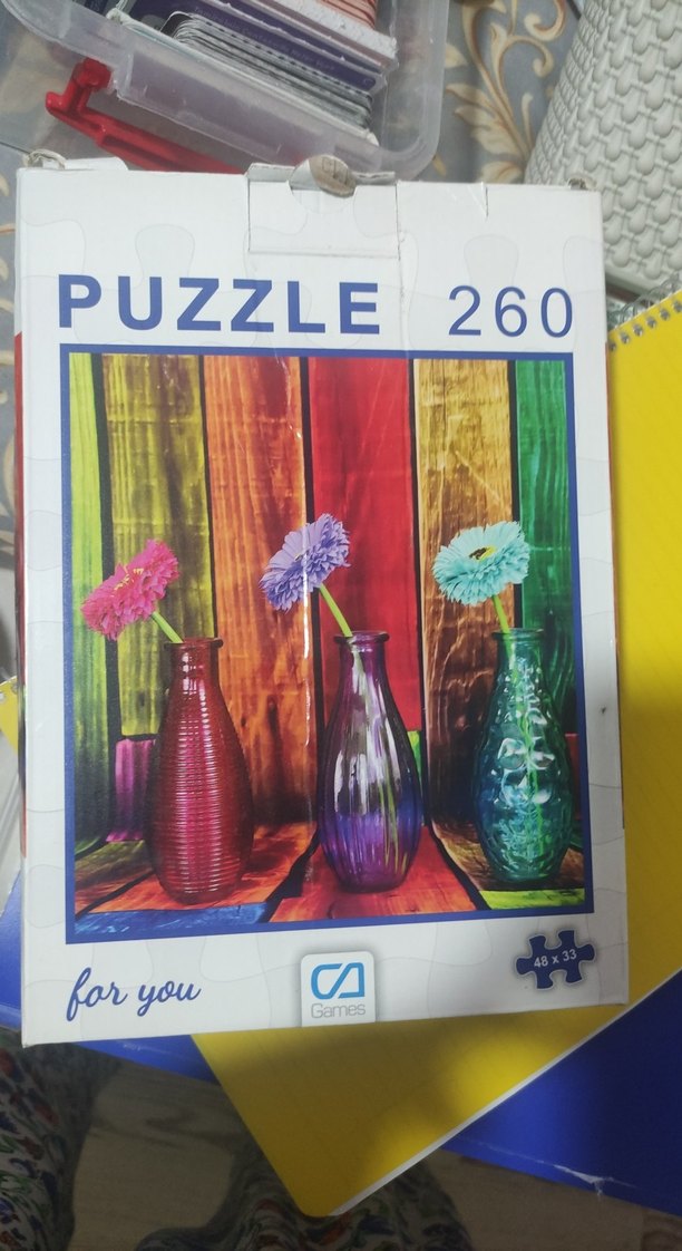 260 parça renkli puzzle, üç çiçekli vazoyu ve canlı ahşap arka planı gösterir. Boyutu 48 x 33 cm.