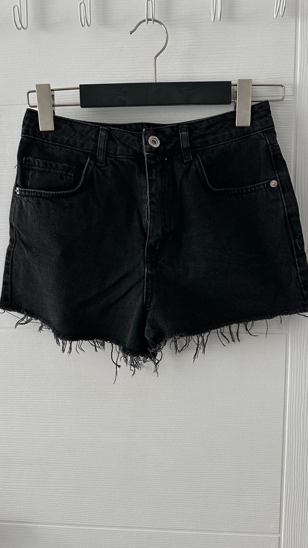 Salaş kesim, siyah denim mini şort, uçları tırtıklı. Günlük ve rahat sokak stili için ideal, zahmetsiz şıklık sunar.