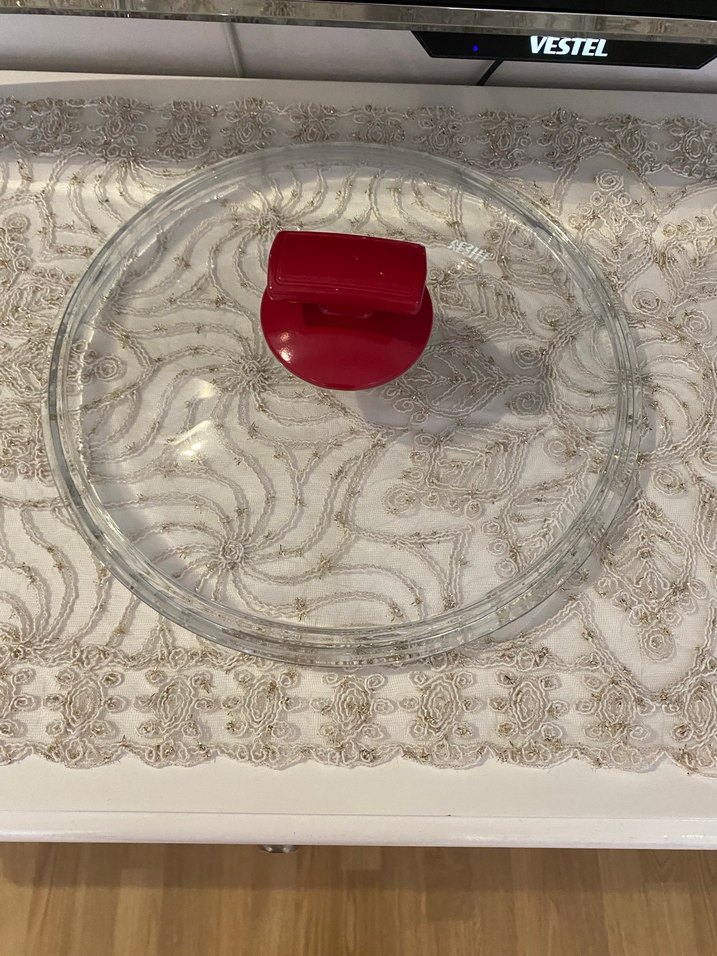 Üzerinde 'ESTE' yazan parlak kırmızı saplı yuvarlak cam fırın kabı.