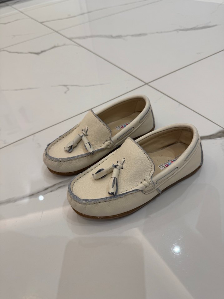 Sadece 1 kere düğün de kullanıldı . Ayağı büyüdüğü için bir daha kullanamadık çok şık erkek çocuk ayakkabısı . Beyaz renkte, püsküllü ve kauçuk tabanlı erkek çocuk özel ayakkabısı. Klasik zarafetle sokak stiline uygun, desensiz ve pastel tonlarda.