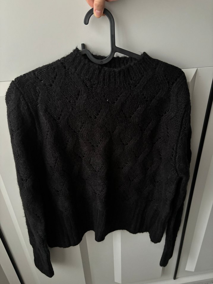 Bu siyah örgü kadın kazağı, uzun kollu ve yuvarlak yakalıdır. Günlük kullanım için uygun, vücuda oturan rahat bir tasarıma sahiptir.
