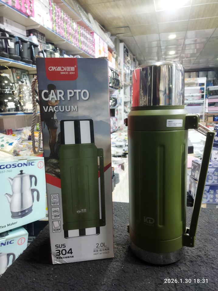 2 litrelik kapasiteye sahip haki renk vakumlu termos, içecekleri sıcak veya soğuk tutar. Taşıma kolaylığı sağlayan dayanıklı sapı vardır.