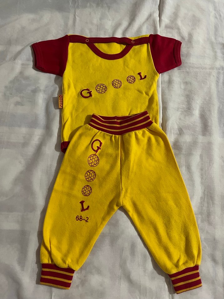 Sarı renkli, kısa kollu ve bisiklet yaka örme kumaştan yapılmış, renkli baskılı bebek erkek takımıdır. Rahat ve şık sokak stili sunar.