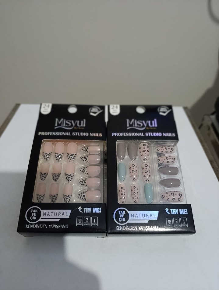 Misyul kendinden yapışkanlı, bej tonlarında doğal tırnak süslemeleri. Farklı açık ve canlı desenlere sahip, kolay uygulanır ve çıkarılır.