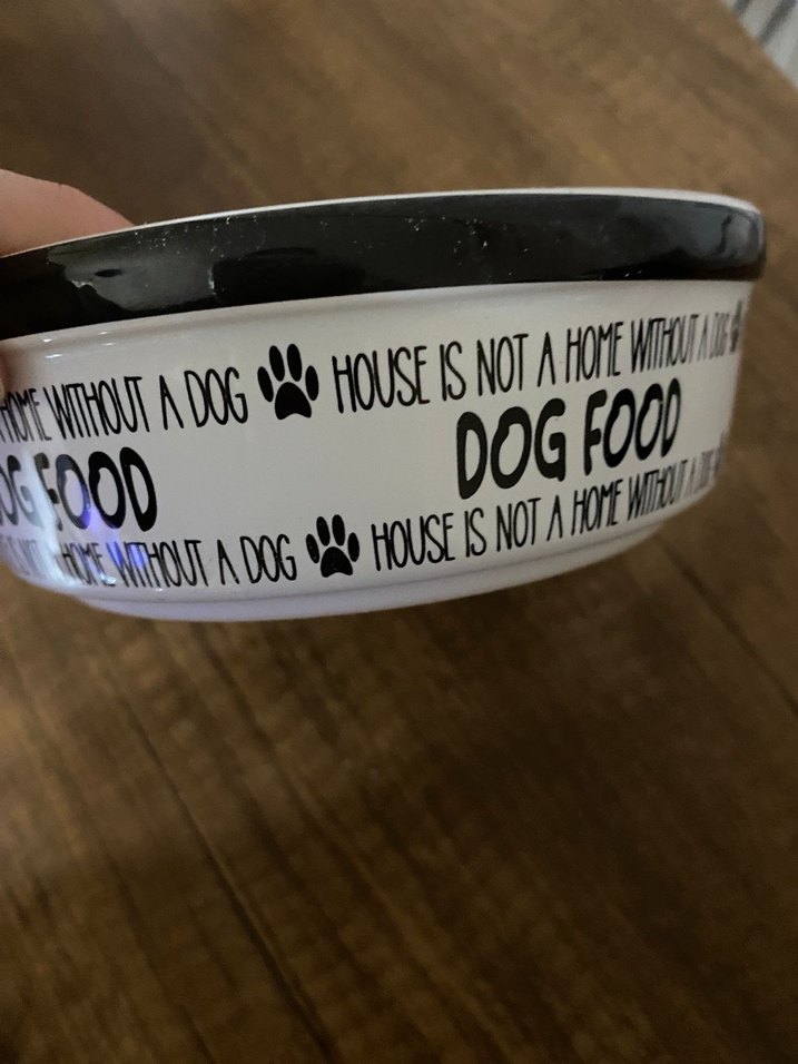 Siyah kenarlı beyaz köpek mama kabı, "House is not a home without a dog" yazısı ve pati desenli. 2’li olarak satılmaktır. Hepsi fabrikadan çıkma sıfırdır. Hasarları yoktur.