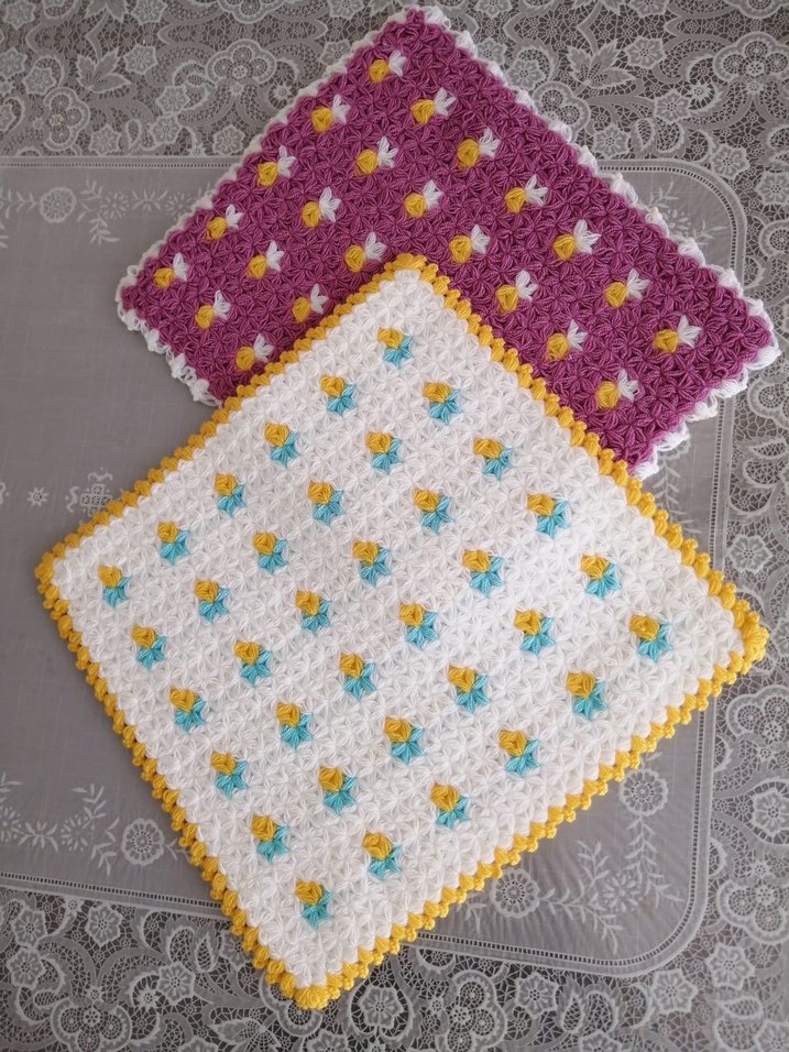 Çiçek desenli, renkli el örgüsü banyo süngerleri. Mor ve beyaz tabanlı, sarı ve mavi detaylarla süslenmiş.