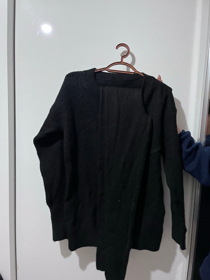 Siyah, örgü yün kumaştan, uzun kollu ve bisiklet yaka olan bu kadın hırka, bol kesimi ve midi boyuyla rahat ve şık bir günlük tercihtir.
