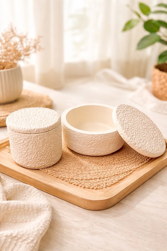 Beyaz pastel renkte, dokulu yüzeye sahip, kapaklı iki parçadan oluşan dekoratif set Evde yumuşak ve şık bir atmosfer sağlar. ️