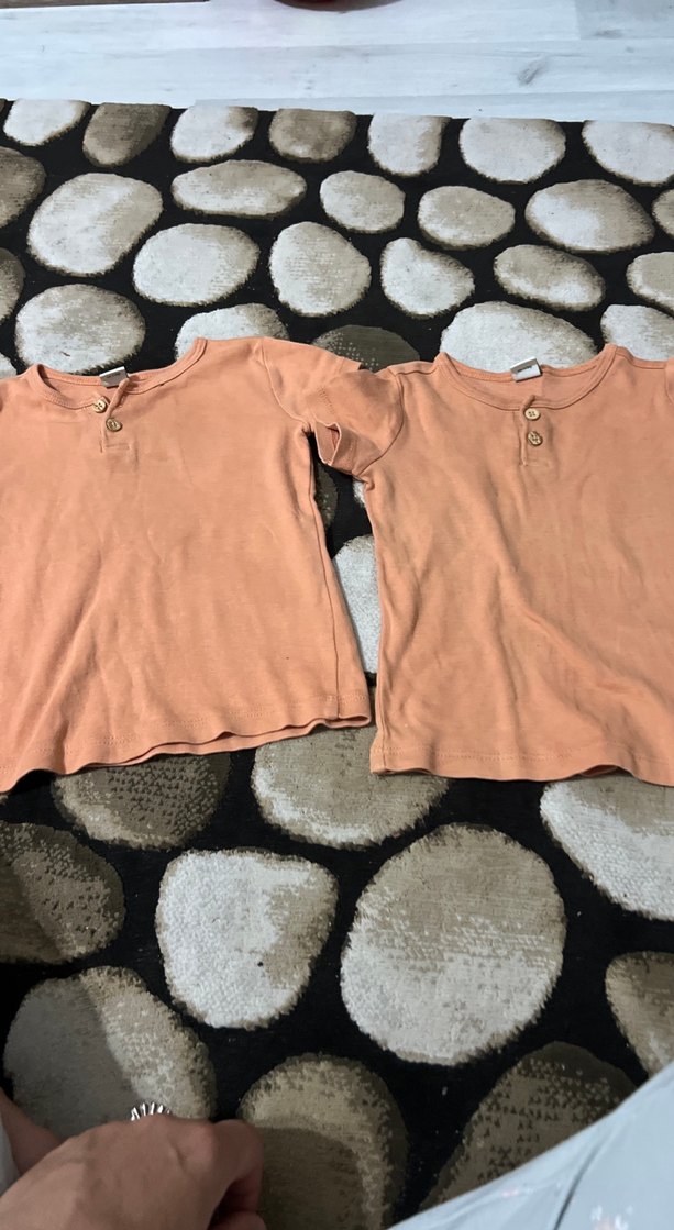 Pastel kahverengi, kısa kollu çocuk içlikleri, yaka kısmında düğme detaylı. Çocuklar için yumuşak kumaş. Birinde birazcık leke var o kadar