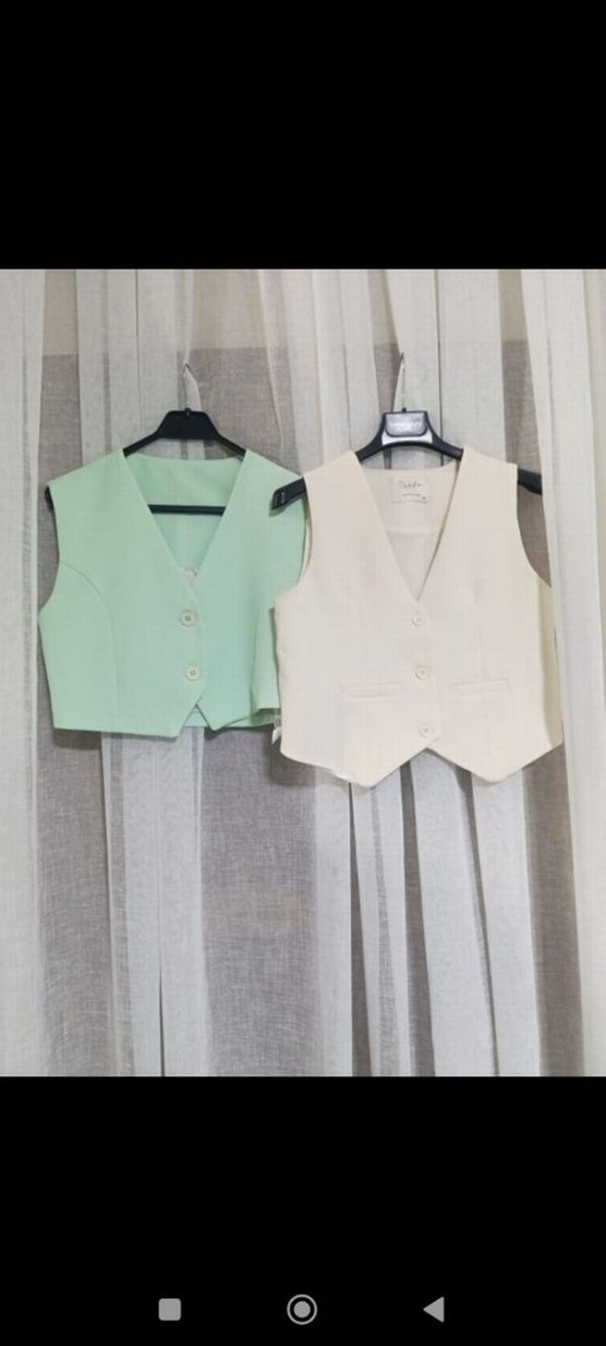 Pamuk kumaştan yapılmış, düğmeli, kolsuz ve mini uzunlukta kadın yeleği. Minimalist ve ofis tarzına uygun, pastel renklerde ve desen içermeyen sade tasarım.