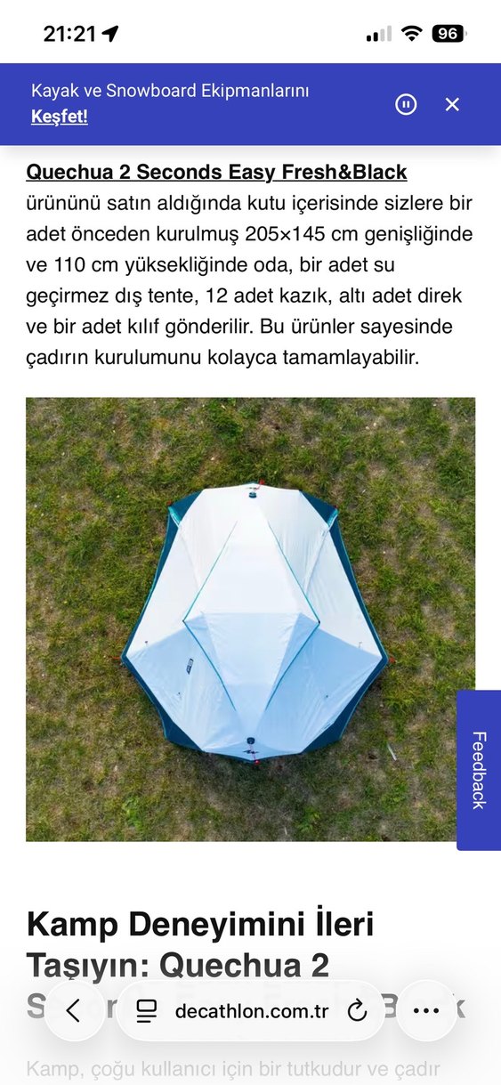 Ürün 205x145 cm genişliğinde ve 110 cm yüksekliğinde, 4,7kg. su geçirmez dış tente, 12 kazık, 6 direk, kılıf içerir. Kurulumu kolay toplaması kolay güneşi içeri almıyor iki kapılı ve ikisi de sineklikli. yazın kullanıma uygun black and fresh özelliğiyle 2 kere kullandım yağmur görmedi tertemiz