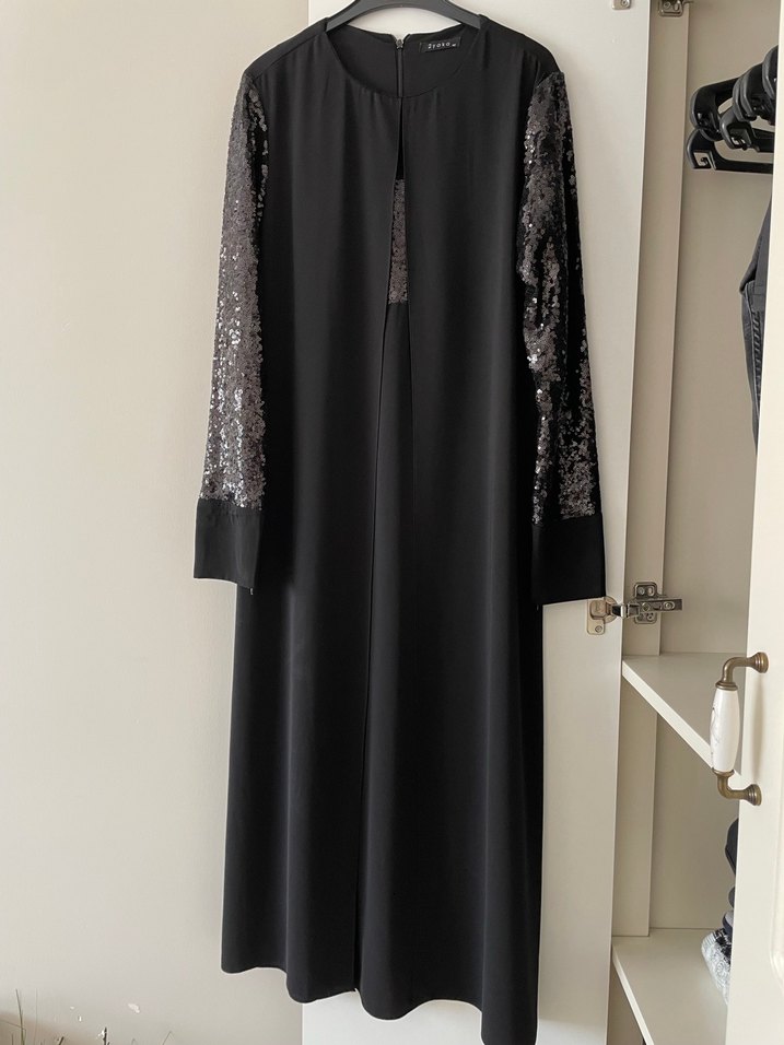 Uzun siyah kadın elbise, payetli uzun kollara ve bol kesime sahip, sentetik kumaştan üretilmiştir. Ofis için uygun, mütevazı bir tarza sahiptir. ✨
