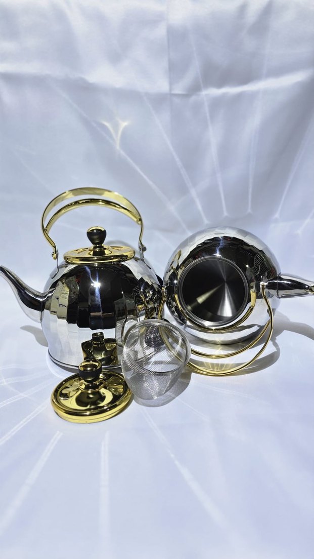 Parlak altın sap ve kapaklı, renkli gümüş gövdeye sahip çaydanlık seti. Demlik için tel süzgeç içerir.