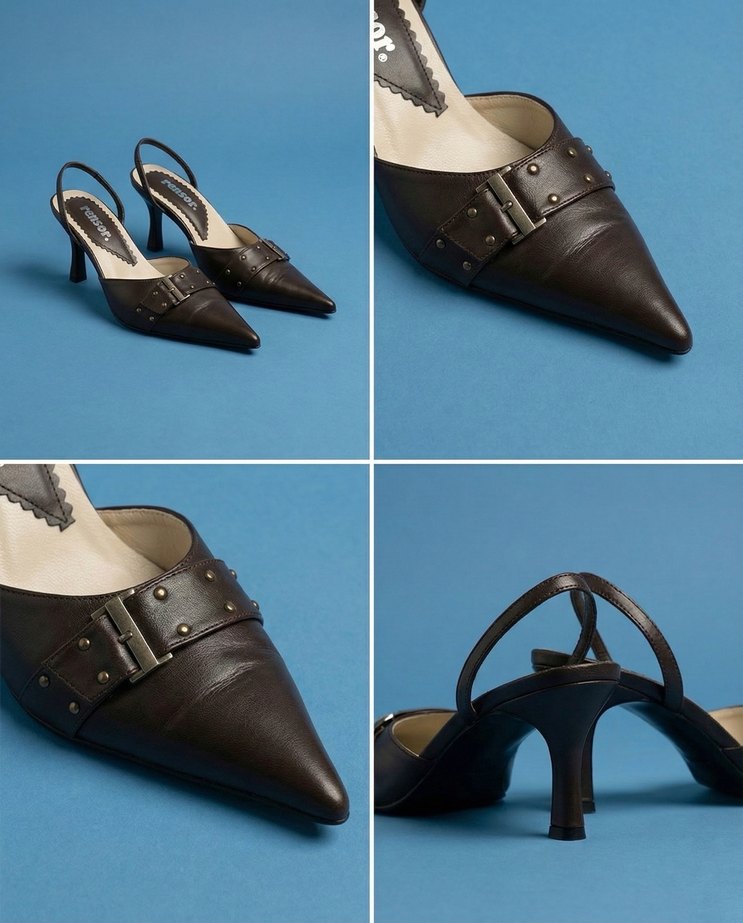 Kahverengi deri, sivri burunlu ve tokalı kayışlı stiletto topuklu ayakkabı, klasik ya da gotik.