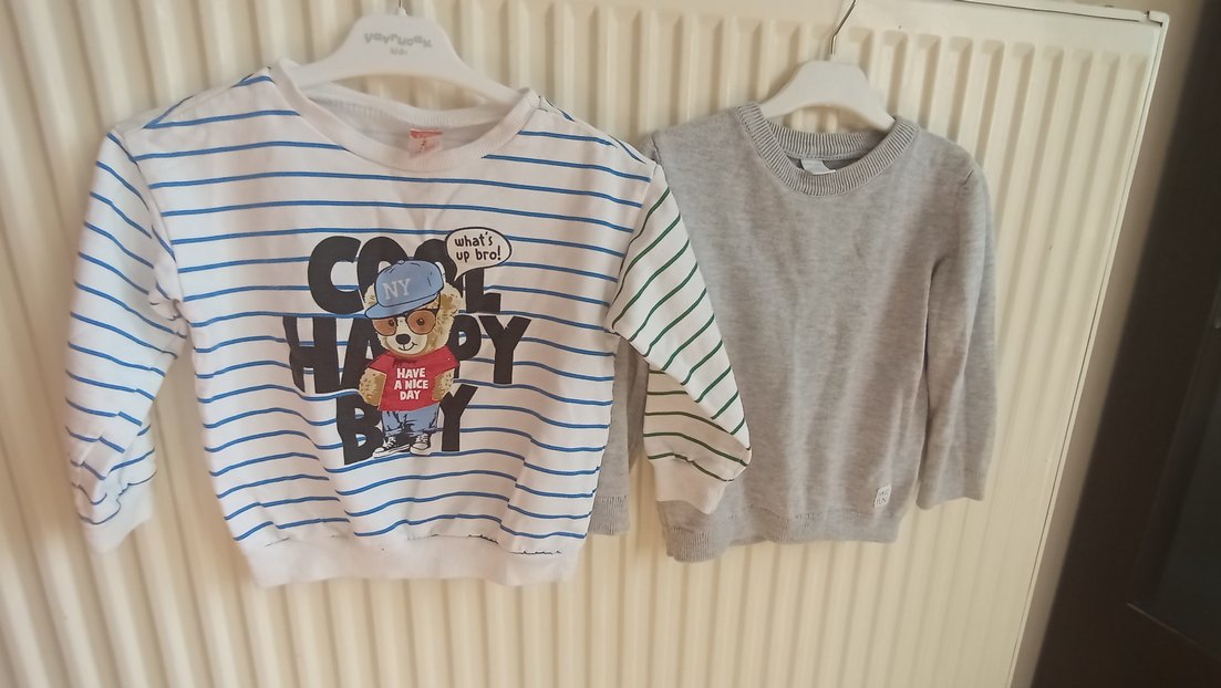 Erkek çocuklar için pamuklu, uzun kollu, geniş kesim gri sweatshirt. Örme dokusu ve çizgili baskılı tasarımı ile rahat ve şık.