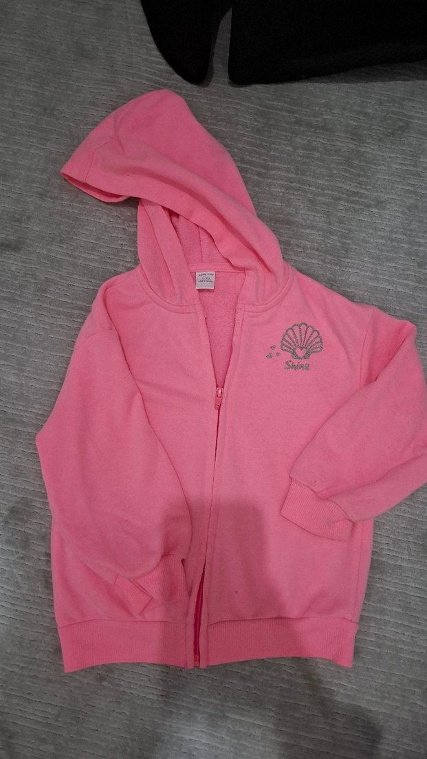 Pembe kapüşonlu kız çocuk sweatshirt, fermuarlı ve uzun kolludur. İnce kalıp, kabuk desenli ve yumuşak sıcak kumaştan üretilmiştir.