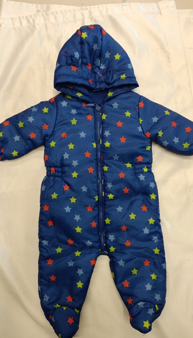 Renkli mavi yıldız desenli bebek tulumu, fermuarlı ve yumuşak sıcak kumaştan yapılmıştır. Küçükleri dışarıda sıcak tutar. ❄️ kusursuz