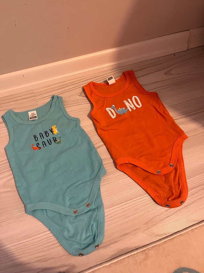 Askılı pamuklu erkek bebek body, renkli dinozor desenleri ve kolay giydirme için çıtçıtlı. Rahat sokak stili için uygun.