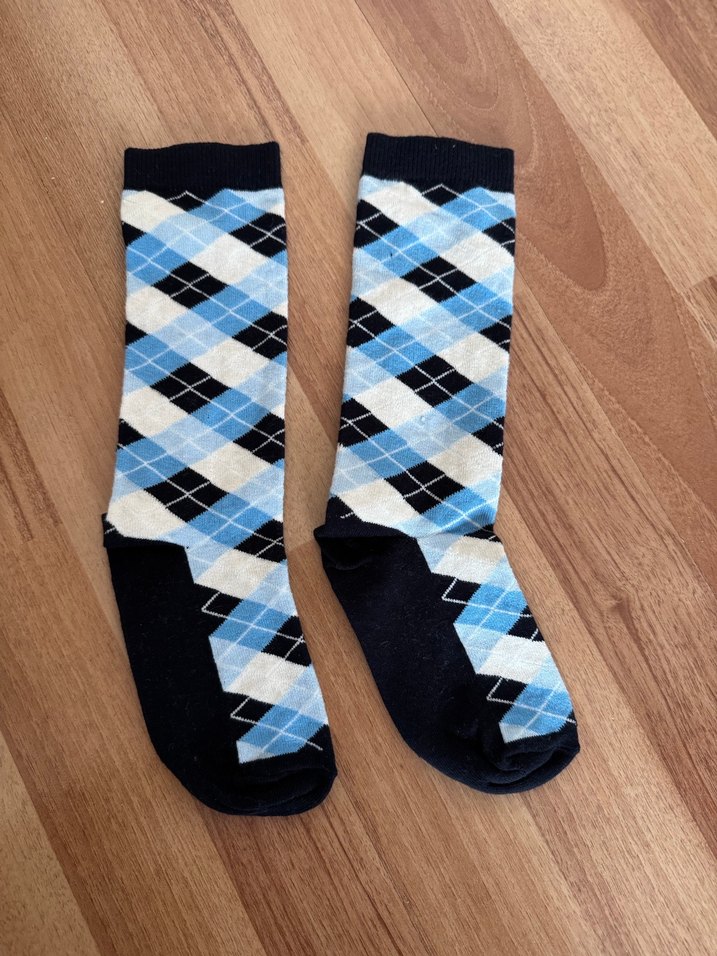 Kız erkek için mavi ve siyah renklerde bağlama desenli, normal midi boyda rahat kesim çorap.