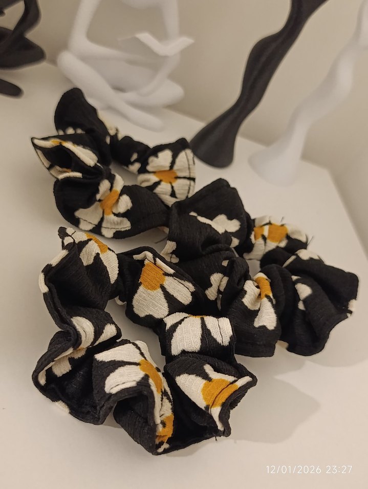 Sentetik kumaştan yapılmış, siyah çiçek desenli elastik saç tokaları. Bohem ve vintage tarzlara uygundur.
