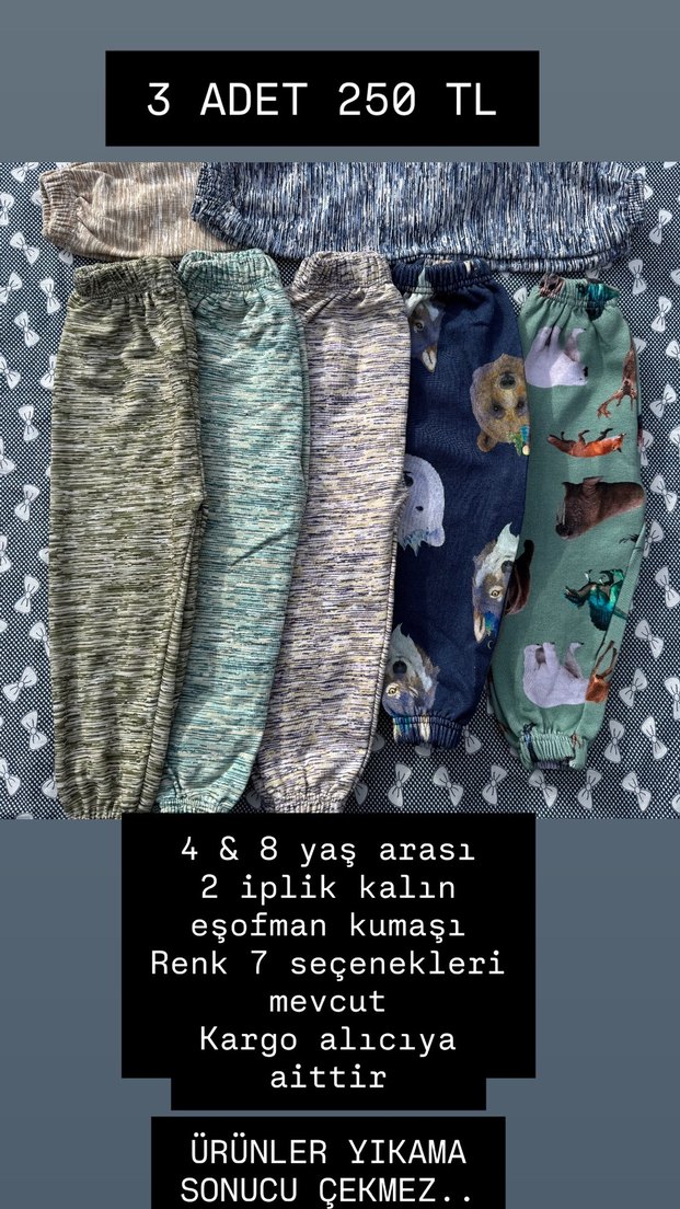 4-8 yaş arası erkek çocuklar için kalın, örme dokulu sentetik kumaştan, çok renkli bağlama desenli ve baskılı bol kesim eşofman altı.