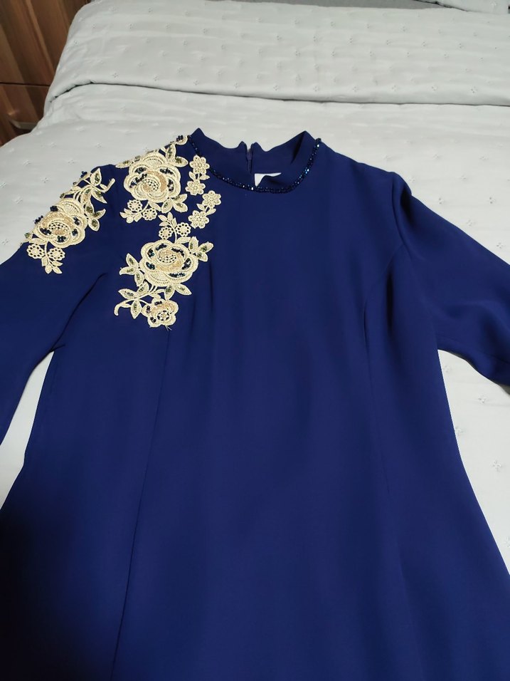 Parlak mavi kumaş üzerinde omuzda detaylı dantel nakış bulunur.