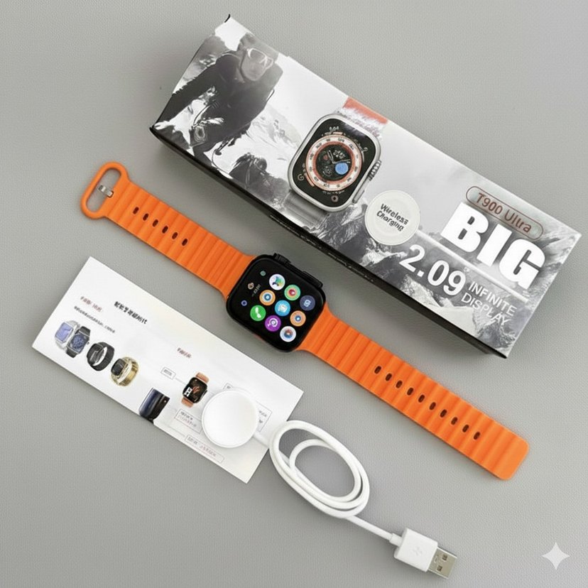 2.09 inç canlı ekranlı, turuncu kayışlı koyu renk akıllı saat. Kablosuz şarj özelliği vardır. 3 adet Akıllı Saat fiyatidir