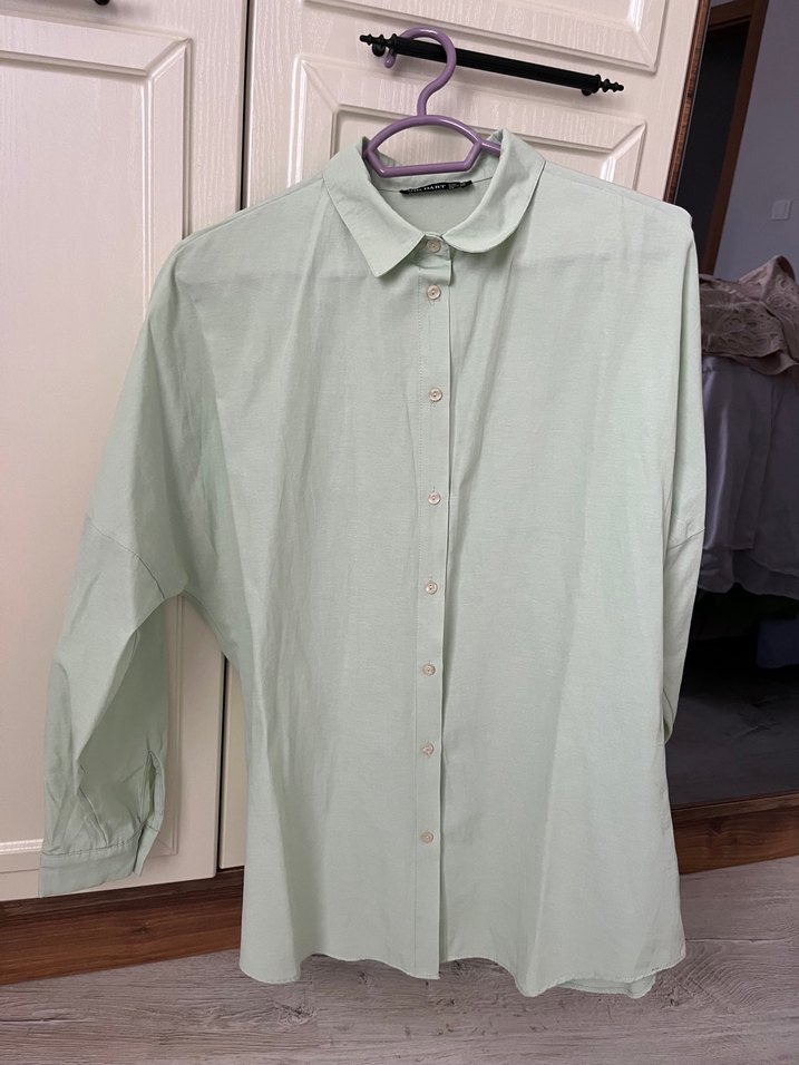 Pastel yeşil, düğmeli, uzun kollu, keten kumaştan, rahat kesim kadın gömleği. Günlük kullanıma uygun, sade ve şık.