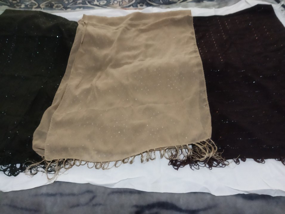 3 adet bej kahverengi ve koyu yeşil renklerinde şal başortu fular olarakta kullanılır hiç bir sorunu yok kullanilmadi adet fiyatı.35tl 3 tane alana 100 tl