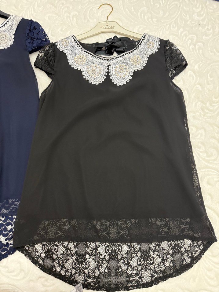 Siyah, kısa kollu, dantel ve nakış detaylı, kısa boylu, loose fit gotik tarzda bluz. Yaka kısmı yakalıdır.