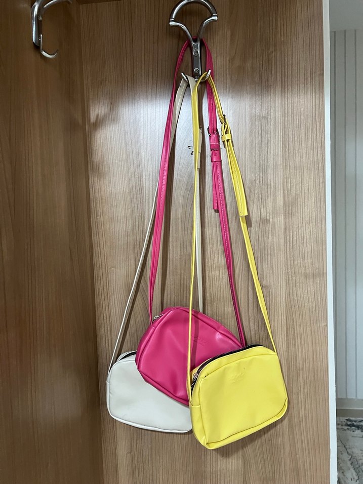 3 adet çanta 200₺ dir.Sarı pembe ve krem renk.hafif lekeler var dolapta beklemenden kaynaklı sanırım kullanılmadı çünkü.Temizlenince çıkar