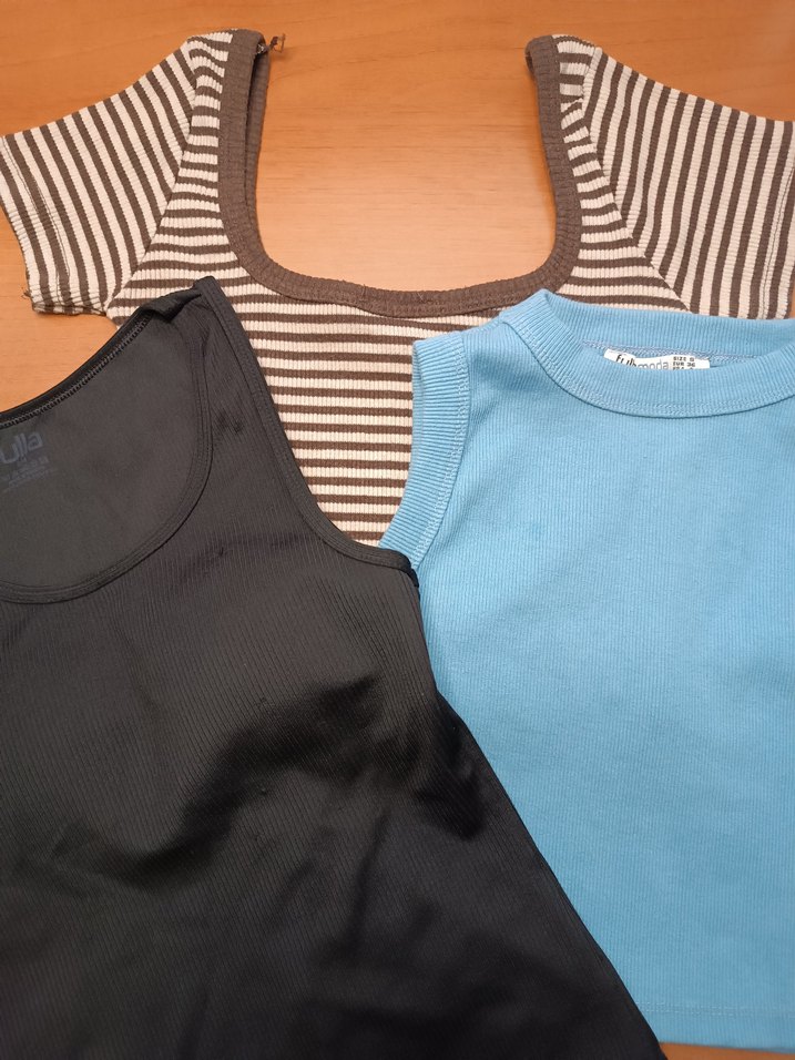 kahverengi çizgili olan S beden %80'i pamuk %15 polyester %5 elestan içeriyor mavi olan S/36 beden etiketini kestiğim için materyaline bakamıyorum ama daha pamuklu bir yapısı var siyah olan S/M beden esnek kumaş aynı şekilde etiketini kestiğim için içeriğini okuyamıyorum. siyah olanin içinde kendinden pedi var. ayrıca birkaç yerinde ip kaçması var. sorularınız varsa sorabilirsiniz