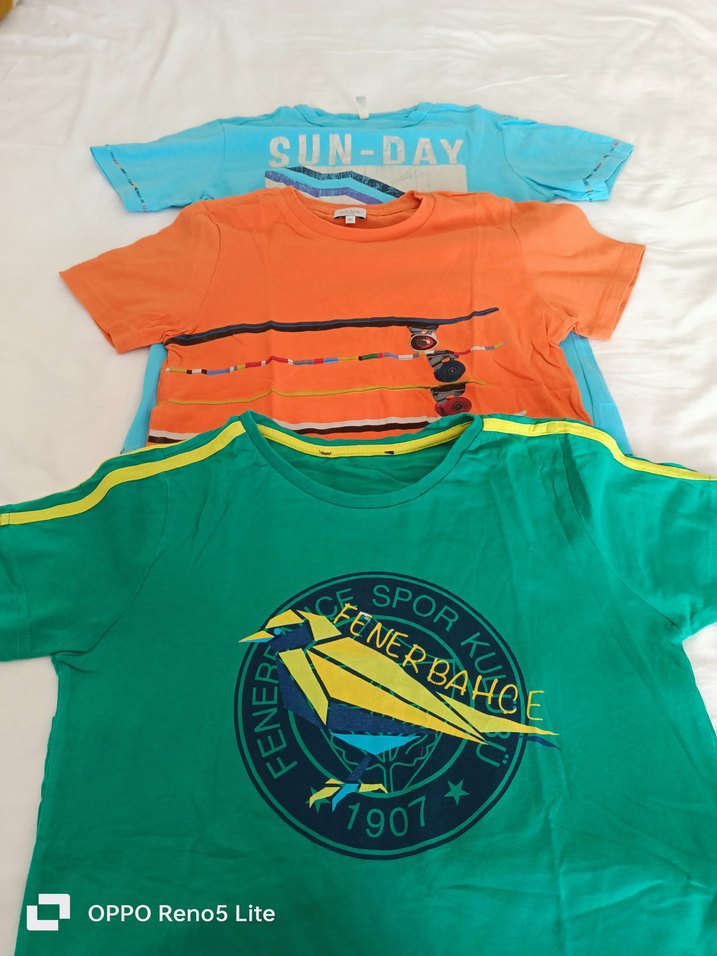Fenerbahçe markalı yeşil renkli ,Paul Smith marka turuncu renkli ve Benetton marka mavi renkli pamuklu 10 yaş 3 adet tshirt