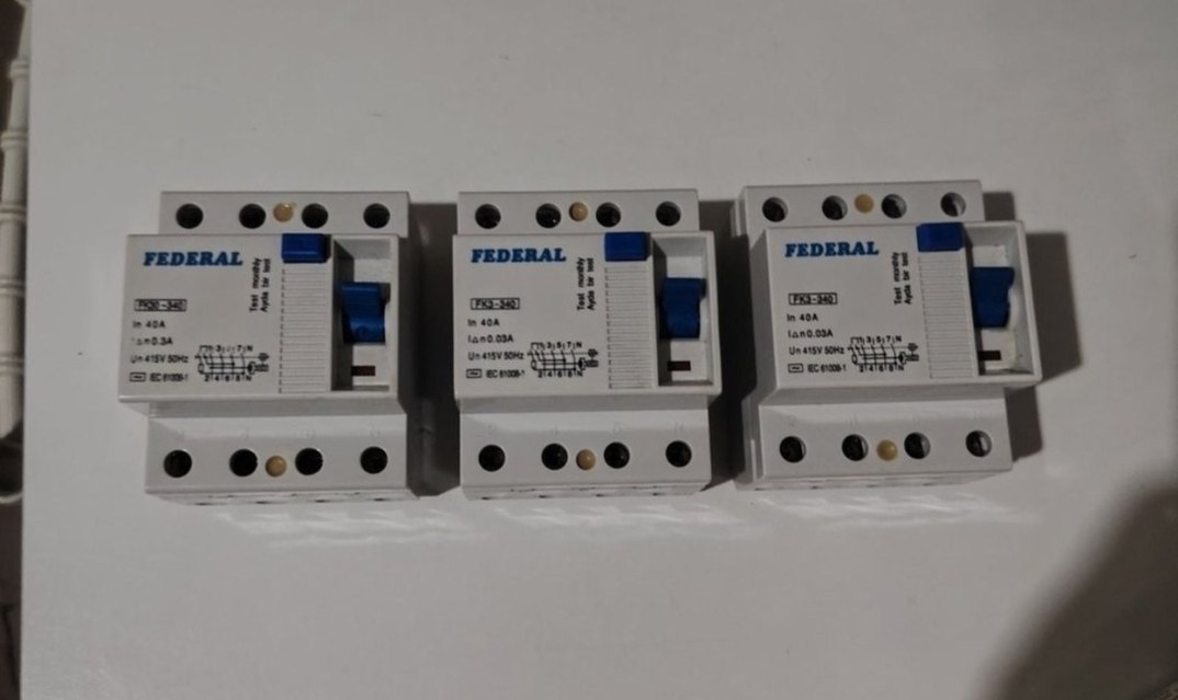FEDERAL marka 40A elektrik kesici, beyaz ve gri renkte, 415V ve 40A akım değerine sahip. Mavi anahtarlı ve güvenlik işaretli. ürnler sıfırdır ⚡3 adet fiyatıdır