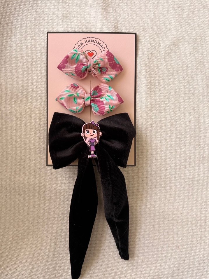 Kız çocukları için el yapımı üçlü fiyonk saç tokası seti, iki pembe çiçekli ve bir koyu renkli bağlama desenli tokadan oluşur.