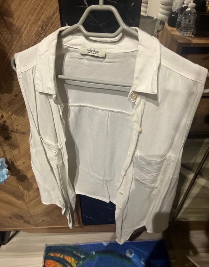Düğmeli, kolsuz, yakalı ve salaş kesim gömlek. Günlük rahat kullanıma uygun, sade ve hafif tasarımlı. Beyaz , siyah , bebe mavisi ,kolsuz, düğmeli, yakalı ve bol kesim gömlek, rahat sokak stili için uygundur. ☀️hiç kullanılmadılar dolapta durduklarından kırışma oldu sadece. Geniş kalıp m bedene 38 bedene uyumludur. Sadece ütü istiyorlar başka hiçbir sorunu defosu yoktur. Önden bağlanabiliyor. Hiç kullanılmadılar.