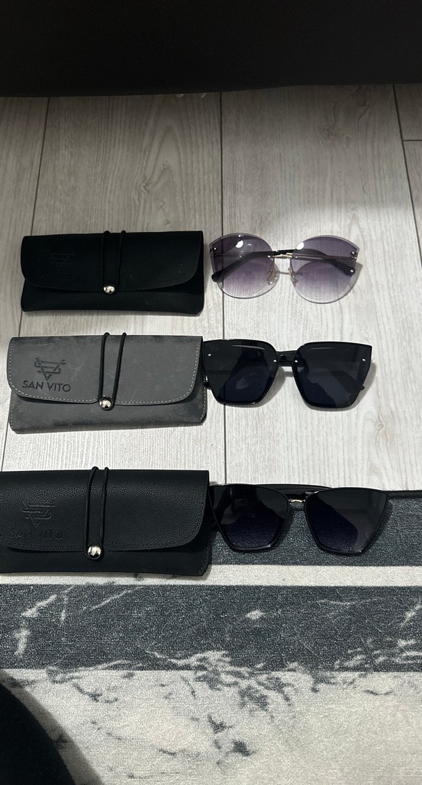 3 ünü birden satıyorum. Ayrı da verebilirim. Dolap bekliyor. İsteyene gitsin istiyorum. SAN VITO markalı gri minimalist güneş gözlükleri, sokak tarzı ve zahmetsiz şıklık sunar. Her biri koruyucu kılıf ile birlikte gelir.