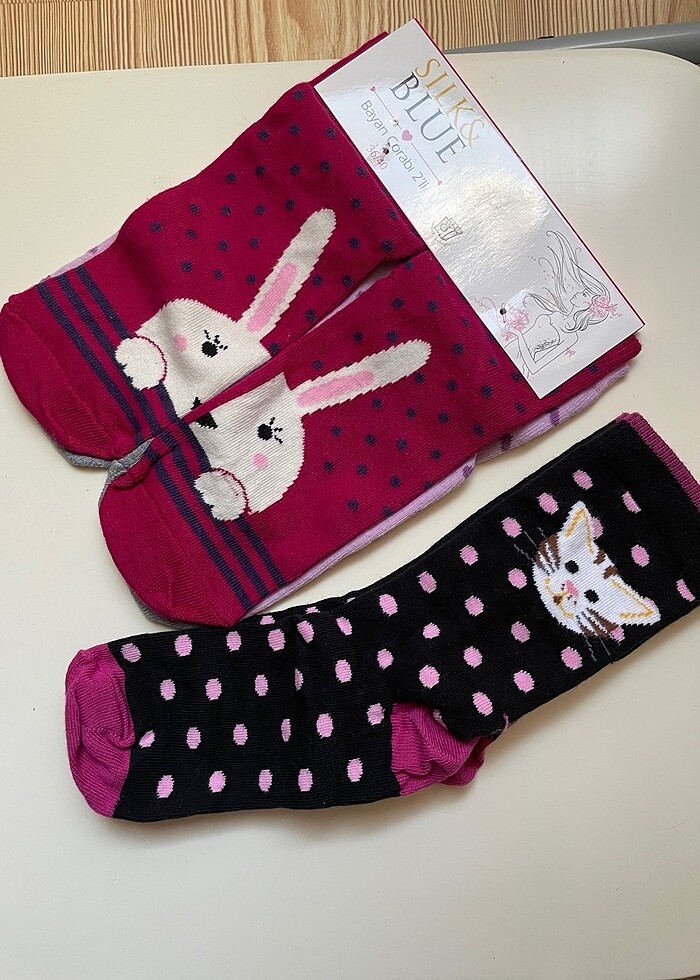 3 adet hayvan desenli renkli çorap. Baykuşlu çorap, kedili çorap ve tavşanlı çorap. Üçü de giyilmedi 2 si etiketli biri etiketsiz, etiketsiz olan daha uzun. Üçü de bayan çorabı diye geçiyor ama 35 numara ve üzeri herkese uyar