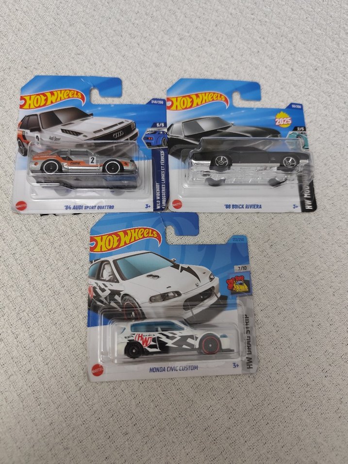 Hot Wheels markalı üç farklı gri oyuncak araba: Audi Sport Quattro, Buick Riviera ve Honda Civic Custom. Her biri özgün detaylara sahip.
