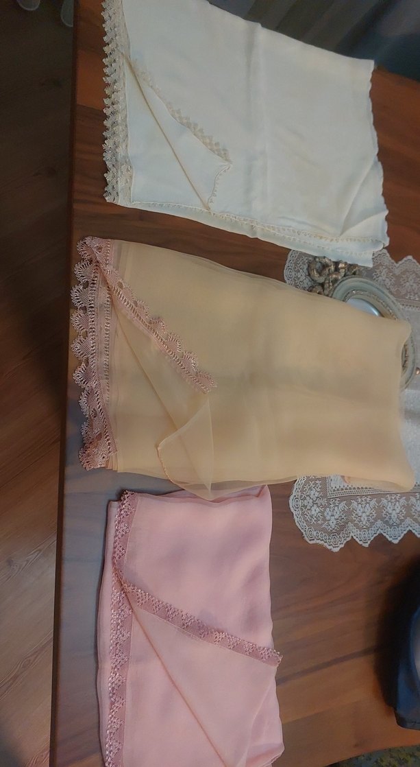 Pastel tonlarda, dantel detaylı, ipeksi dokulu kadın örtü. Bej, krem ve pembe renk seçenekleriyle,70 yıllık çeyizden.Kremde örtüde sandık lekesi var.Pembedede köşede delik var.