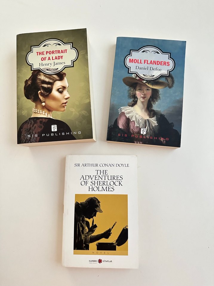 3 adet İngilizce sıfır kitap.Henry James/The Portrait of a Lady 752 sayfa. Daniel Defoe/Moll Flanders 374 sayfa. Sir Arthur Conan Doyle/The Adventures of Sherlock Holmes 344 sayfa.Hepsi sıfır kullanılmadı.
