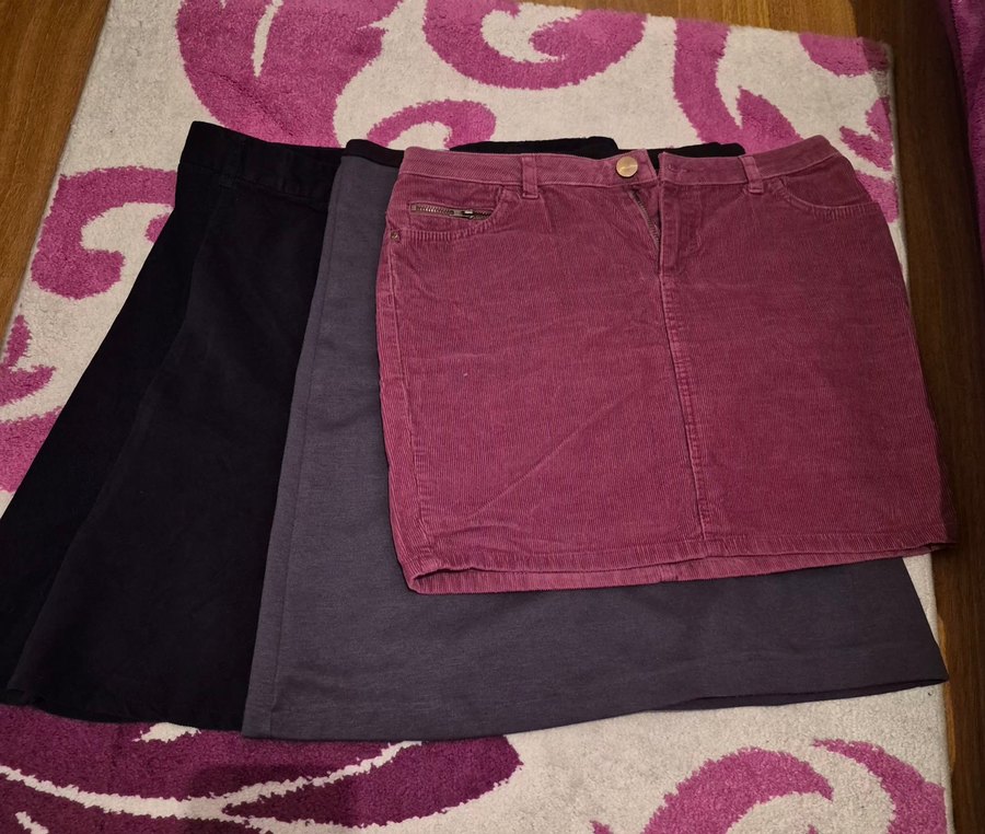 gri önü fiyonklu Fusion marka 36 beden astarli yandan yırtmaçlı boy 52 cm, Siyah çanak model lcw marka 36 beden astarsız cord kumaş yandan fermuarlı boy 52 cm,gül kurusu renginde olan XSIDE marka önden fermuarlı ön ve arka cepli cord kumaştan boy 39 cm astarsız 40 bedendir.