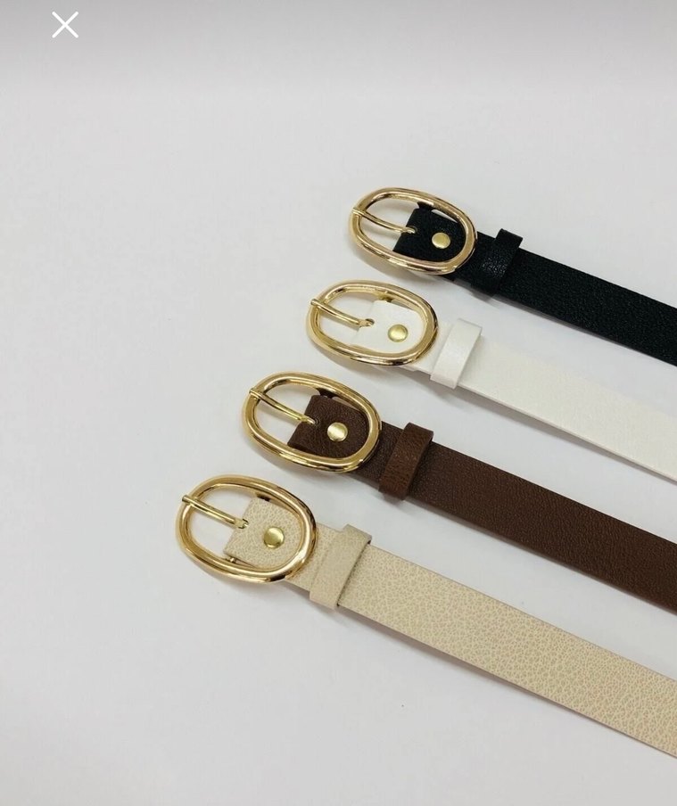 Altın tokalı, 3 renk deri kadın kemerleri. Minimalist ve çağdaş tasarıma sahip, sade ve temel stiller için uygun. Bej beyaz kahverengi vardır