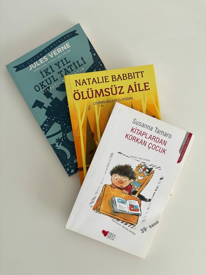 İki Yıl Okul Tatili + Ölümsüz Aile + Kitaplardan Korkan Çocuk. Üzerlerinde herhangi bir yazı, işaret vs. yoktur. #canyayinlari #isbankasiyayinlari #julesverne #susannatamaro #nataliebabbit