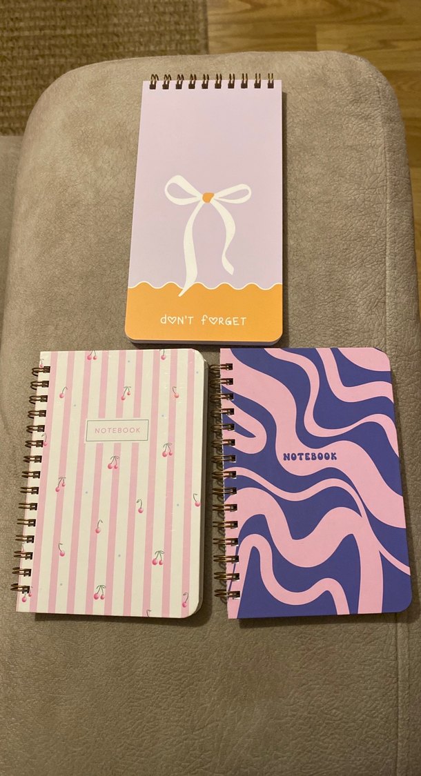 Çizgili ve dalgalı desenlere sahip pastel pembe spiralli defter seti, kapaklarında "NOTEBOOK" yazısı bulunur.