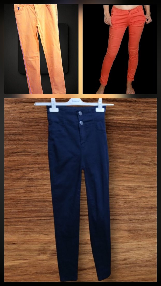 iki adet turuncu ve bir siyah yüksek bel pantolon.Bej renkli, midi boy, düz desenli kadın pantolon. Rahat sentetik kumaştan, fermuarlı detaylı, günlük sokak stili için uygun.