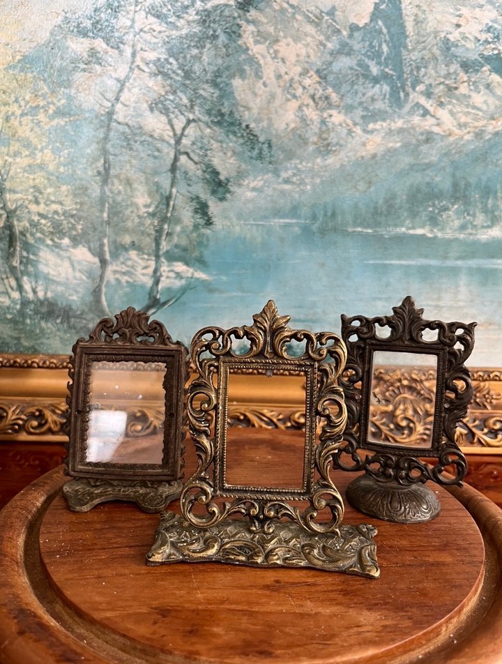 Küçük fotoğraflar veya sanat eserleri için uygun, karmaşık desenlere sahip koyu altın renkli dekoratif çerçeveler. Mekâna nostaljik bir hava katar. ️